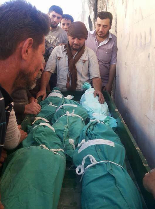 | A man in Maarat Numan, Idlib Province, Syria, stands with the bodies of his five children who, along with his wife, were killed in a Syrian air force airstrike on 12 June 2016. |
